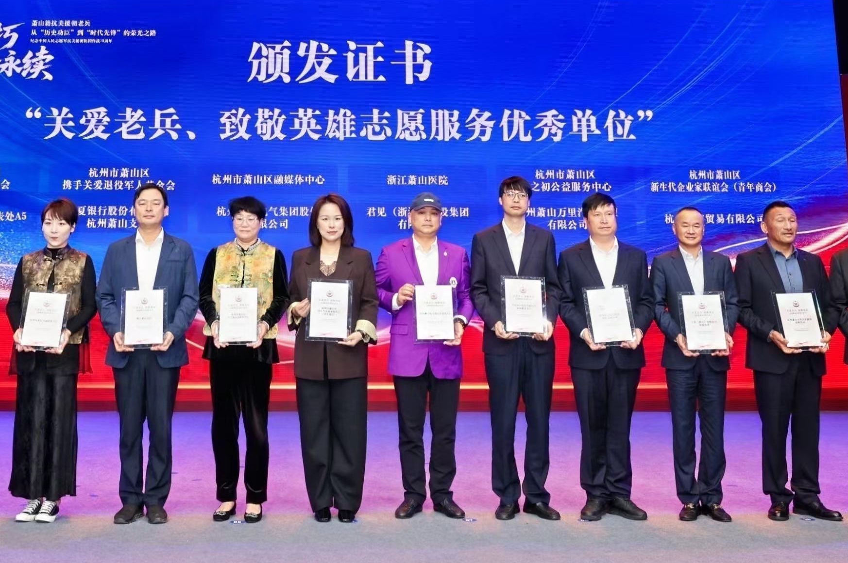 10 月 24 日,蕭山區(qū)舉辦“蕭山籍抗美援朝老兵從‘歷史功臣’到‘時代先鋒’的榮光之路——紀(jì)念中國人民志愿軍抗美援朝出國作戰(zhàn)75周年”活動。由于公司在關(guān)愛老兵志愿服務(wù)領(lǐng)域的突出表現(xiàn),榮獲蕭山區(qū)“關(guān)愛老兵,致敬英雄志愿服務(wù)先進(jìn)單位”證書,公司黨委副書記、人武部長曹錕出席活動并上臺領(lǐng)獎。